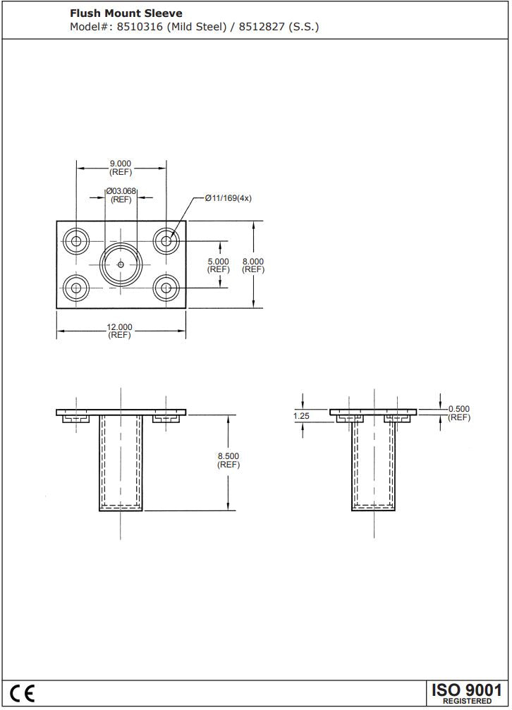 Floor mount sleeve davit base, flush mount design, stainless steel, for Advanced offset davit mast.
