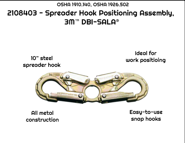3M DBI-SALA Spreader Hook Positioning Assembly features self-closing and locking mechanism. Used with a carabiner or snap hook to create a position assembly.