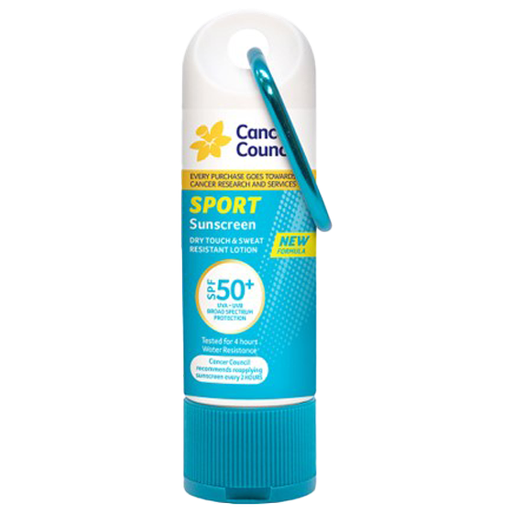 Dry-Touch and Sweat resistant lotion. 50ml Ezyclip bottle. Travel size designed to attach to sports bags. Can also be attached to school bags. SPF50+ and 4 hours water resistant. Sweat resistant. Enriched with aloe vera and vitamin E. Great for sports requiring grip such as tennis golf cricket and baseball. Light non-greasy and moisturising. Easy to apply and fast drying. Fragrance and paraben free. Made in Australia.