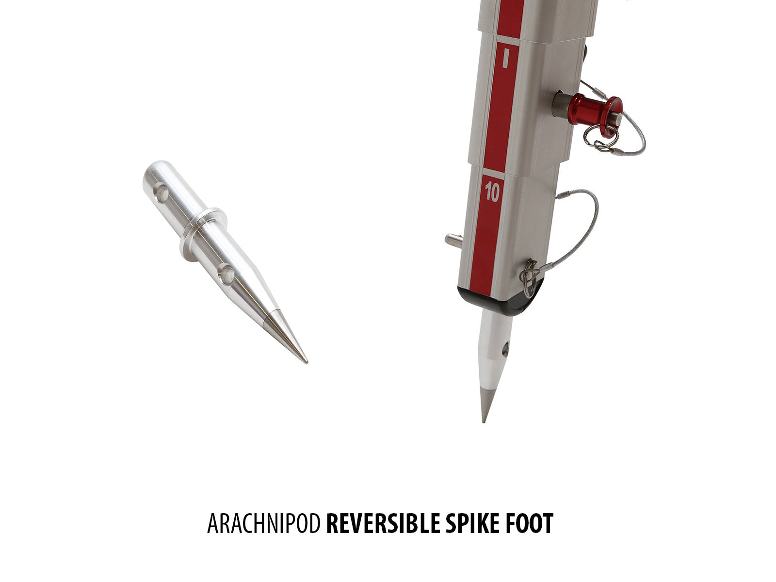 The dual-ended Spike Foot features a rounded end and a spiked tip. The spiked tip is used for point loading and ground penetration applications, while the rounded end is used in situations where the spike may damage or scratch the supporting surface. Included in the Advantage and the Full Accessory Kit, or sold separately.