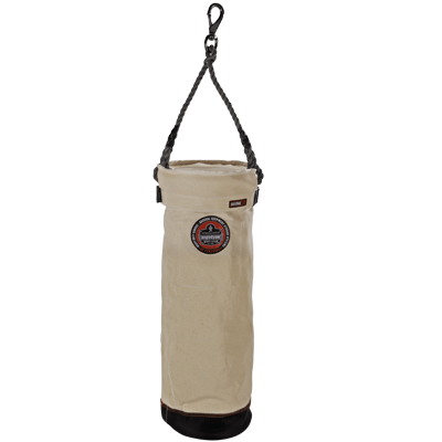 Buckets are an easy way to store and transport tools. These canvas tool buckets are a leather reinforced base and swivel clips. This model includes two interior pockets and a rope handle.