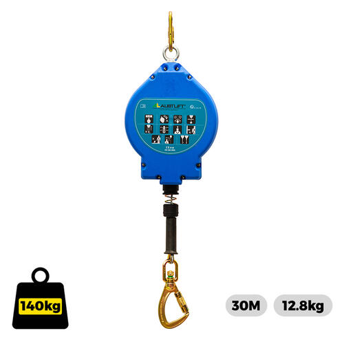 30m Wire Rope Inertia Reel type two Fall Arrest device with carry handle. Swivel eye with triple action steel Karabiner at top. Triple action swivel hook bottom with fall indicator. Conforms to EN360:2002