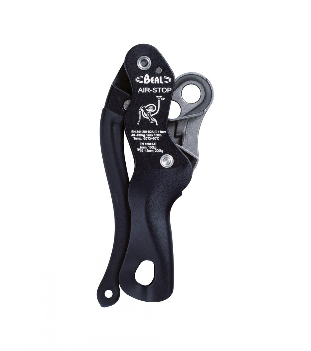 Auto-block descender with anti-panic function for a single rope.