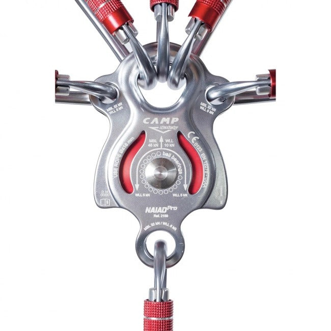 High strength multifunctional pulley for block-and-tackle systems and complex operations. Features a large wheel, main attachment hole that accommodates three carabiners, two secondary holes on the sides, and a large becket. For ropes up to 16 mm. Prusik minding, the self-locking knot can be installed on both sides. Self-lubricated bushings are perfect for light applications at low speed. Efficiency: 90%. Aluminum alloy body and wheel, stainless steel axle.