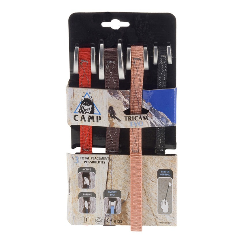 The Tricam Evo is a logical evolution of the tried & true, time-proven Tricam. Some simple engineering provides a second chock possibility giving the Tricam Evo three (instead of the historic two) placement possibilities making it even more versatile. The wider section at the top of the head that creates the extra taper will also lend additional stability in cammed placements. The Tricam Evo is be available in four sizes from 0.25 to 1.5. Naturally, the Tricam Evo also features the new stiffened slings where we carry the inner band of webbing further towards the head using a new stitch pattern to create a naturally stiffer sling that makes one-handed placements easier, but still engages the cam in active mode and will even increase durability over sharp edges with the additional layer of material.