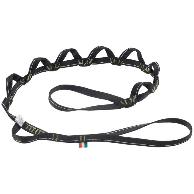 The spiral construction of the Daisy Chain Twist addresses one of the main concerns with traditional daisy chains where the user clips a single carabiner through two adjacent loops creating a situation where they are secured by nothing more than the single bar tack between the loops instead of the 22 kN strength of the entire loop. Robust 16 mm polyester construction with special machine-driven bar tacks distribute the load multidirectionally.