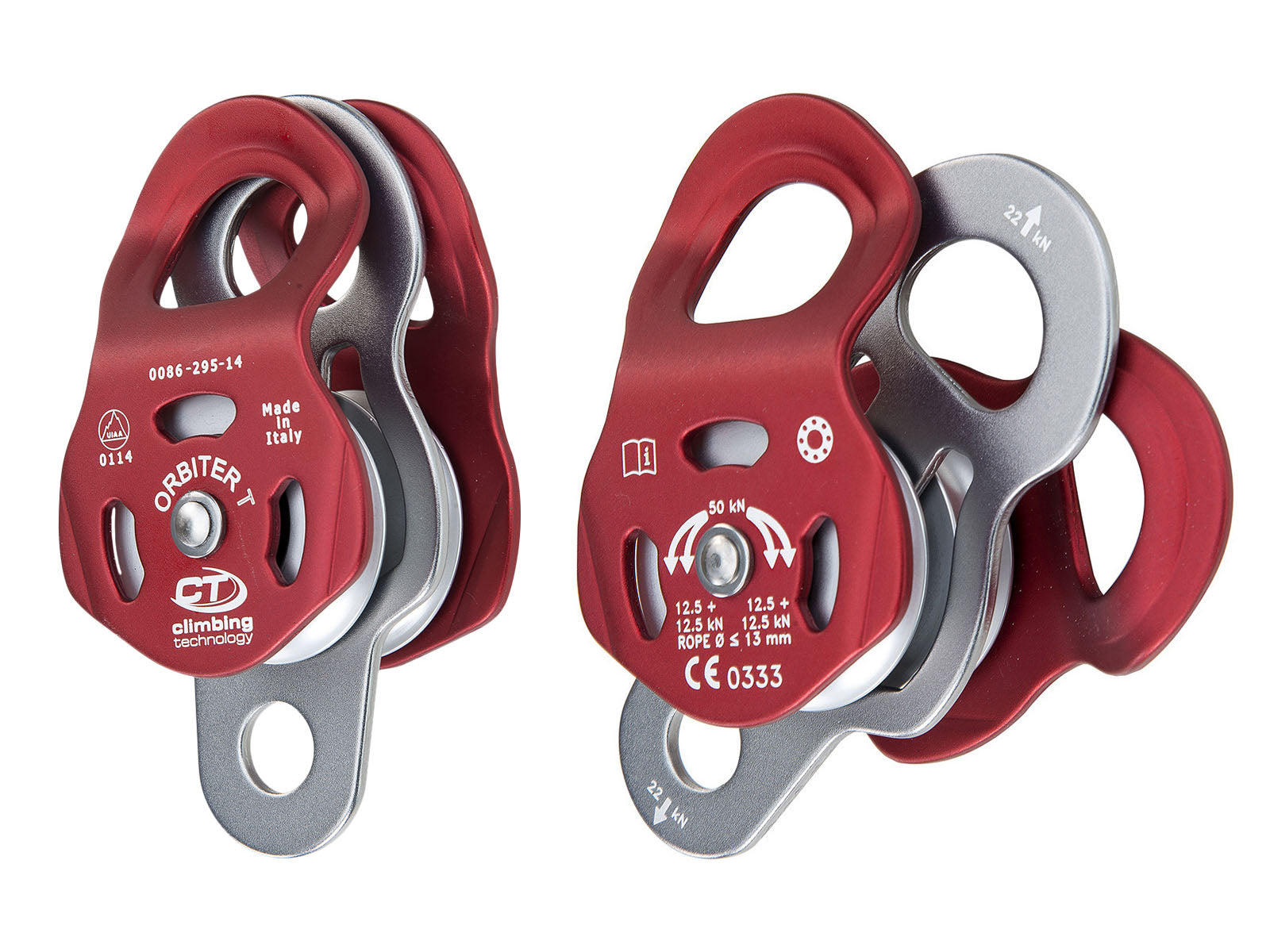 The Orbiter T is a light, alloy double pulley with oscillating side plates with twin sheaves mounted on heavy duty ball bearings. Up to three connectors can be hooked in to the large eyelet plus one connector into the becket.