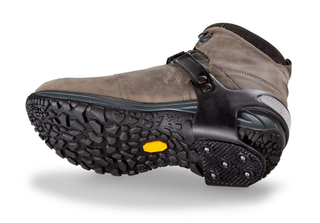 The material of the body of the Devisys anti-slip Heelstop is a TR rubber mixture that provides a good grip while remaining frost-resistant. Strategically placed and dimensioned on the outsole are durable, hard metal studs - similar to those used on winter ice-tyres. A 3M reflector placed in the rear provides additional safety for dark / low-visibility winter conditions.