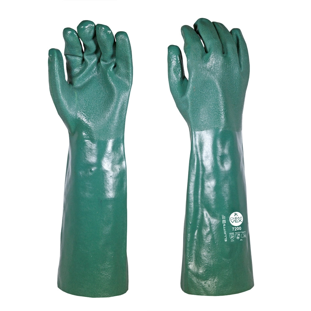 The ChemVex® 7200 is a chemical resistant gauntlet style glove with cotton interlock knitted liner. This PVC glove, which has been double dipped for extra protection, performs well to protect against a variety of chemicals including hydrocarbons and certain solvents.