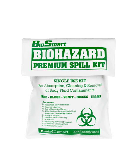 BioSmart Premium BioHazard Spill Kits are your first response for fast and safe cleaning and removal of urine, vomit, blood, saliva and faeces. These spills need to be handled properly. To assist you, we provide clear directions, personal protective equipment, pH neutral detergent, absorbent cloths, clinical waste bags, disinfectant wipes together with BioSmart Premium Absorbent containing Zeolite for a thorough clean-up.