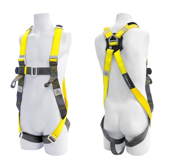 • Oil, Dirt and water repellent webbing.• Highly UV Resistant Webbing• Large permanently upright D-ring fall arrest rated.• Stainless Steel 2/3 bar buckle connection.• Fall arrest frontal belay loops.• Certified & Approved to AS/NZS 1891.1.• The standard harness is a one-size-fits-all covering M – XL.