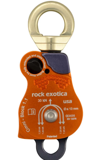 Traditionally, a pulley is connected to a swivel by a carabiner. However, the Omni-Block range eliminates the need for the carabiner, reducing length and pieces of equipment in the rigging system, important when used in high-angle, confined space or other space-sensitive rigging environments. In addition to this, the Omni side plate swings open, via an ingenious two-stage safety button, without the need to detach the unit from the carabiner, allowing easy re-threading of the rope.