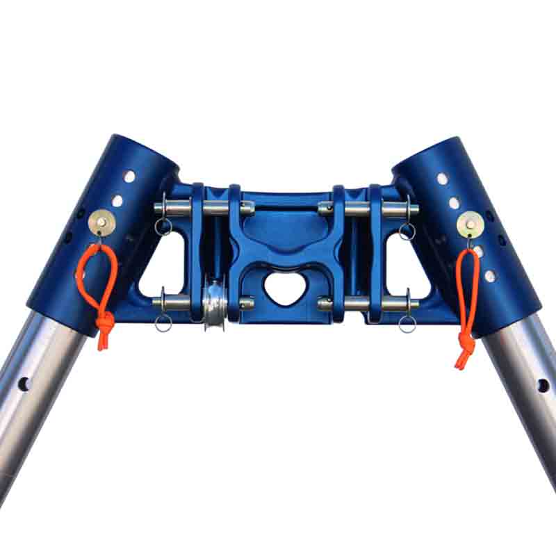 A-FRAME JOINER (VXAF)The A-Frame attaches to the Gin Pole Head to construct the standard Vortex tripod configuration. The A-Frame with legs attached to both sides is also used as a standalone bi-pod rigging piece. The Lower legs can now be used to connect directly to the A-Frame by inserting the bottom end (stud) of the Lower Leg into the A-Frame. A pulley, Omni-Block, or pulley sheave connects directly to the A-Frame with a quick release pin to increase the effective height of the Vortex.