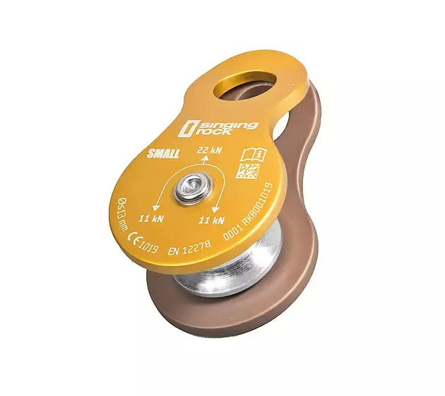 Singing Rock PULLEY SMALL (Ref: RK800**00)PULLEY SMALL / RK800EE00 - Orange - PULLEY SMALL / RK800BB00 - BlackSmall pulley for those who occasionally need to build simple hauling systems or manipulate with the objects. Essential gear for glacier tours in case of crevasse rescue.- lightweight single pulley for hauling and rescue- for use with static and dynamic textile ropes- suitable for use with a Prusik friction knot- brass self lubricating bearing ensures reliable efficiency up to 81 %- unique production number markingColor: orange, blackWeight: 92 g (3.3 oz)Material: sheave and side plates - aluminum alloy, bearing - brass,axle - stainless steelStrength: 22 kNMax. diameter of rope: 13 mmBearing: friction