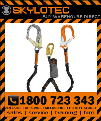 SKYSAFE PRO - 23mm gate steel d/action snap hook & 65mm gate Alloy & steel scaffold hook. TWIN Leg elasticised 28mm SHARP EDGE rated webbing (FIXED LENGTH 1.8mt) - AS/NZS 1891.1 Certified. 50kg to 140kg Rated. All hardware options include fall arrest rated 16kN gates, a unique RESCUE LOOP at the anchorage end of the lanyard. Sharp edge rated.