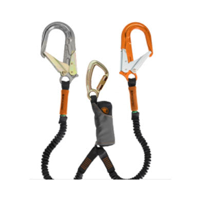 SKYSAFE PRO - 22mm gate steel t/action karabiner & 65mm gate Alloy & steel scaffold hook. TWIN Leg elasticised 28mm SHARP EDGE rated webbing (FIXED LENGTH 1.8mt) - AS/NZS 1891.1 Certified. 50kg to 140kg Rated. All hardware options include fall arrest rated 16kN gates, a unique RESCUE LOOP at the anchorage end of the lanyard. Sharp edge rated.