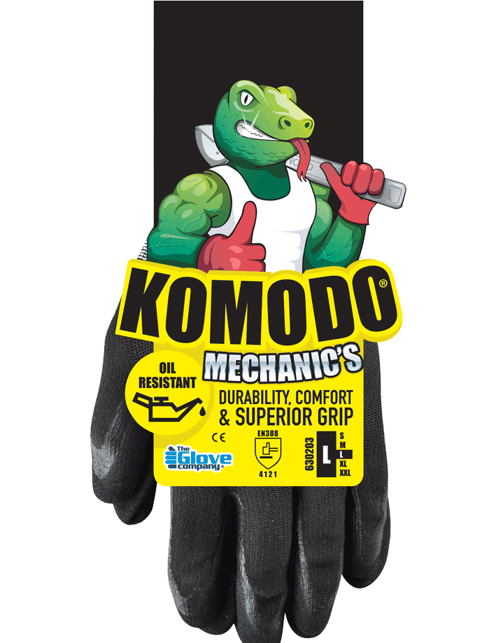 The trustworthy KOMODO Mechanic's Glove. General purpose oil-resistant glove specially engineered for mechanics. KOMODO Mechanic's glove provides a strong dexterous grip for threading bolts to changing brake pads.